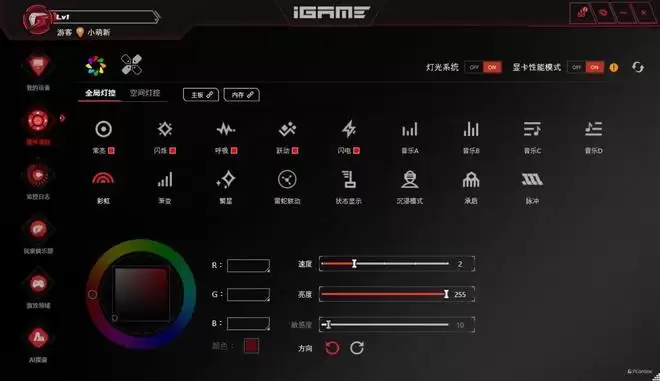 此外,iGame Center更是整机“光污染”的大脑。它能够精准识别并联动主板“智械视窗”与显卡、内存、风扇等全家桶硬件的RGB灯效,实现千人千面的视觉风格定制。从单色的冷峻工业风到律动的赛博霓虹模式,一切皆在掌控之中。