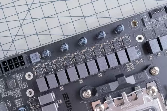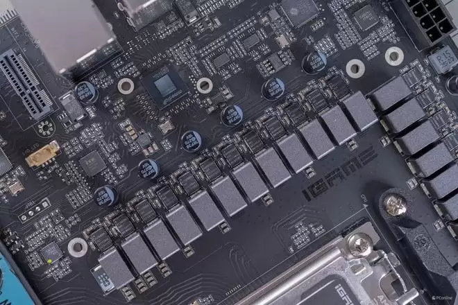 去掉了散热装甲以后,iGame X870E VULCAN OC V14 火神主板才开始露出其恐怖的“獠牙”。这款主板采用了一套极其奢华的18+2+2相数字供电方案。其中,核心供电部分拥有18相,且每一相都直连一颗额定电流高达110A的顶级DrMOS。