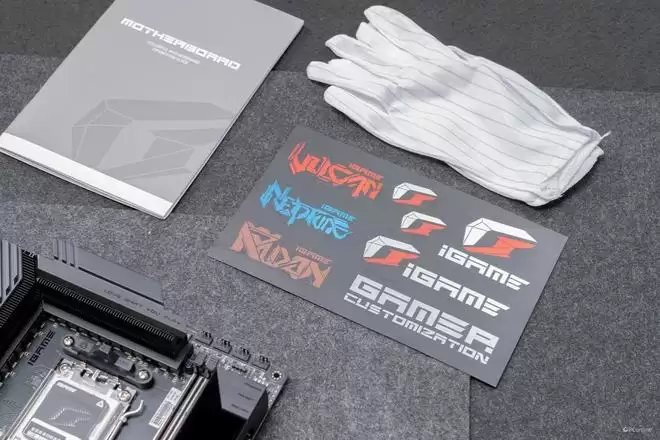 配件方面,iGame这次可谓“倾囊相授”。除了常规的SATA线、WiFi天线、RGB转接线外,还附赠了极其丰富的定制周边:包括一套精密的螺丝刀工具组、驱动U盘、贴纸、手套等,还是非常丰富的。