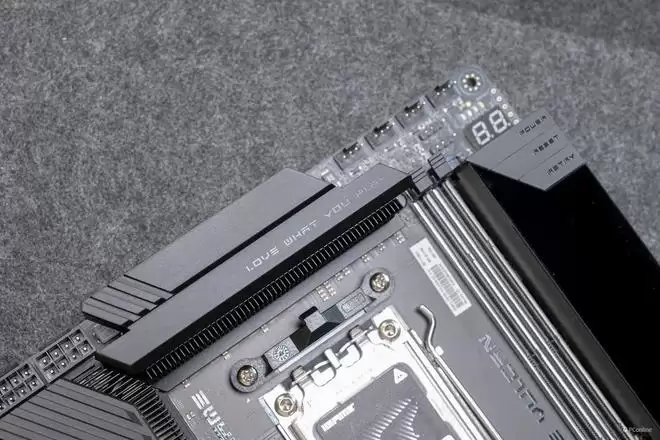 除此之外,这款主板遮住了大部分的元件,尽可能地只露出接口/接针以及常用的插槽,按键面板除了电源重启键之外,还加入了重试(当超频失败死机时,可以按此按键强制对当前配置进行多次尝试,排除主板的自检偏差问题),方便用户进行超频调试。