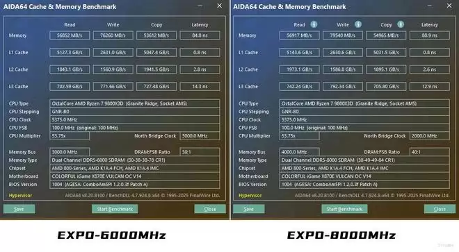我们进一步提高内存频率至EXPO-8000MHz,主板也能轻松点亮,并且内存性能也有一定的提升,延迟也降低了一些,当然,这款主板的潜力应该不至于此,有时间的玩家可以在BIOS中进行更细致的调整,以达到更优的表现。