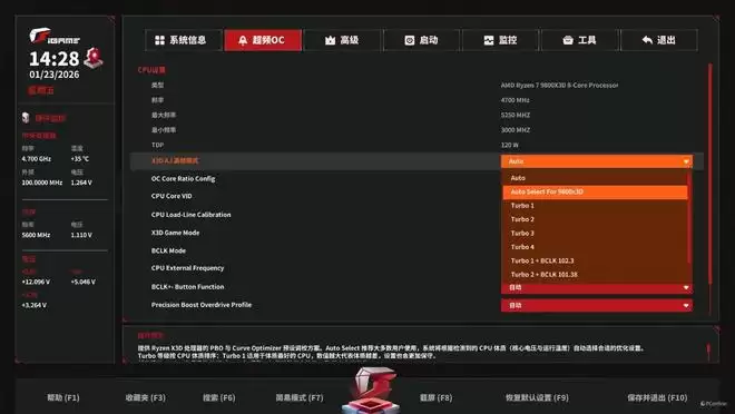 这里给大家解释一下,X3D AI高帧模式中的Turbo1至Turbo4为逐级增加超频及降压,而最后的三档则兼顾了超外频的需求,当然如果你实在不知道选哪个好那就选第一项Auto Select For 9800X3D!无需每个选项去测试,BIOS自己就会根据你的处理器体质调整好合适的参数!