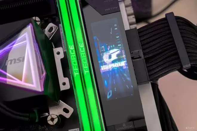 更有趣的是,iGame首次将显卡上备受好评的“火神智屏”移植到了主板上。在内存插槽旁,这块独立的屏幕不仅可以实时显示CPU温度、电压、频率等关键监控数据,更支持用户上传自定义的GIF动图。配合iGame Center软件,玩家可以让心爱的二次元角色在主板上“安家”,这种交互体验让冷冰冰的硬件瞬间有了温度。