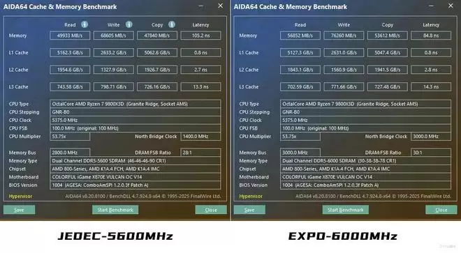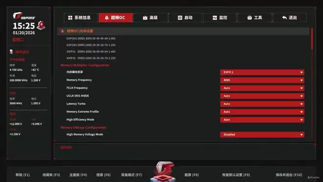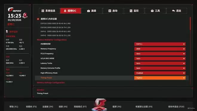 不过众所周知,AMD的甜点频率主要是在6000MHz左右,并且iGame X870E VULCAN OC V14 火神这款主板在BIOS内还有专属的内存高效能模式,据说能够大幅提升内存性能。