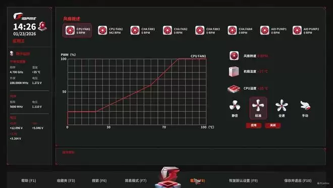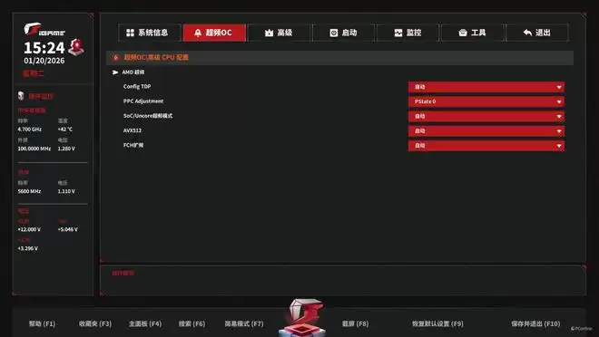 除了硬核的硬件堆料,iGame X870E VULCAN OC V14 火神主板在“软实力”上也实现了质的飞跃。开机进入BIOS,经典的黑红配色扑面而来,视觉效果极具沉浸感。交互逻辑经过了重新梳理,全新的EZ Mode(简易模式)不再是摆设,而是真正将玩家最高频使用的功能——如EXPO/XMP内存一键超频、智能风扇曲线、启动顺序以及PBO模式切换——集中到了首页最显眼的位置。