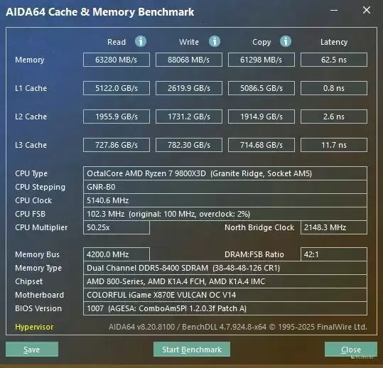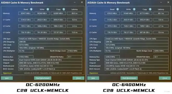 内存超频方面,我们也进行了实测,在iGame X870E VULCAN OC V14 火神上,DDR5-6200MHz C28 同步以及DDR5-6400MHz C28 同步均能轻松点亮!并且内存性能更是冲上了新的境界,读取性能可以来到67633MB/s,写入也飙到了90000MB/s以上,复制也进一步提到了62000MB/s左右,最夸张的还是内存延迟,直接压到了70ns以内。不得不说,这确实是有些惊喜了,完全就是顶级X870E主板才有的水准。