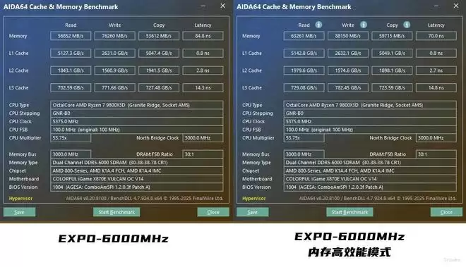这里我们也进行了实测。例如同样是DDR5-6000MHz,在开启了高效能以后,内存的读取由56852MB/s提升至63261MB/s,提升约11%;写入提升也非常明显,由76260MB/s直接上涨到了88150MB/s,提升约14%;复制则是由53612MB/s提升至59715MB/s,提升约10%,延迟更是由原本的84.8ns降低至70ns,总的来说,开启内存高效能后,各方面的性能提升都非常大。