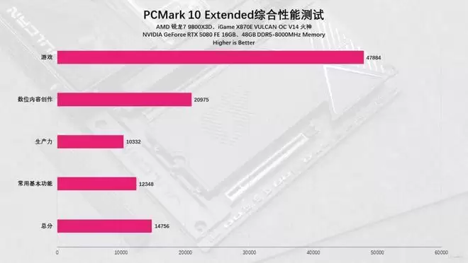 当然,想要了解这台主机在日常使用中的真实体感,PCMark 10 Extended无疑是最佳试金石。它涵盖了从文档办公到重度游戏的四大核心场景。实测显示,以iGame X870E VULCAN OC V14 火神主板为基石的平台展现了极高的综合素质,最终斩获14756的总分。