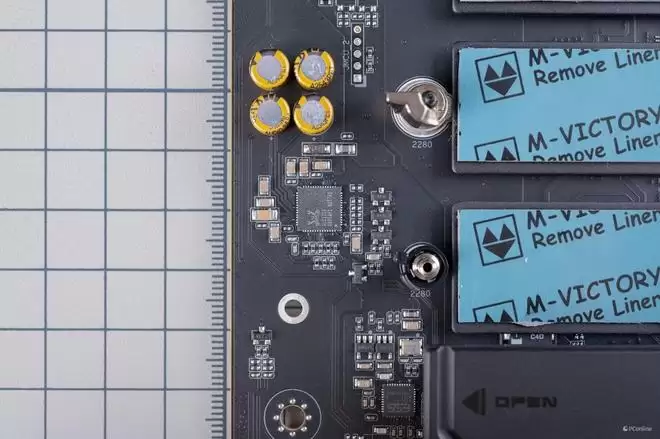 再细看主板电路可以看到,主板上的18相核心供电以及2相SOC供电均采用独立的DrMOS芯片,为瑞萨的R2209004