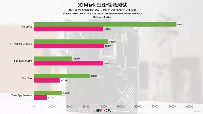 随后我们转战3DMark进行理论性能摸底。无论是考验DX11性能的Fire Strike,还是针对DX12环境的Time Spy,这套平台的表现都堪称完美。特别值得一提的是,在Fire Strike物理测试中,9800X3D的得分势如破竹,一举突破了40,000分大关。
