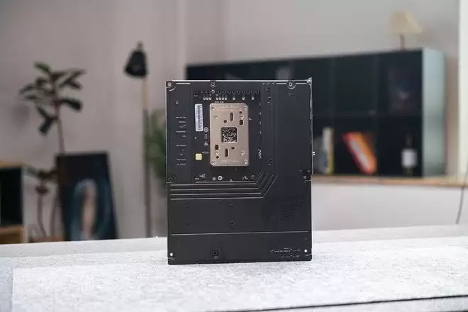 来到主板背面,iGame X870E VULCAN OC V14 火神主板依旧配有大面积的金属背板,增强主板强度的同时,也让整块主板的风格更加统一。