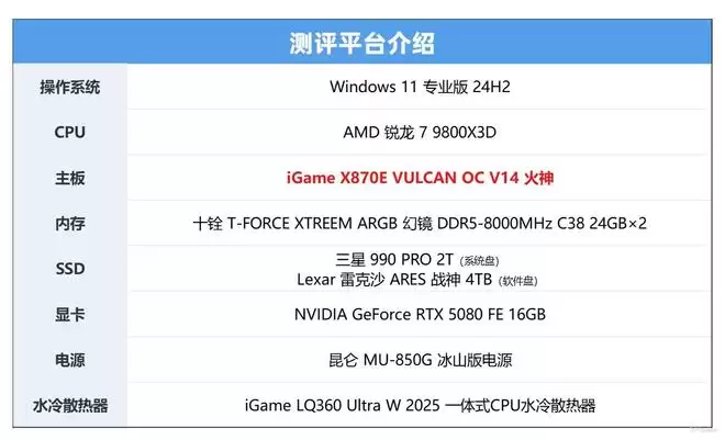 开始测试前,照例介绍一下本次的测试平台,为了发挥iGame X870E VULCAN OC V14 火神的最佳效能,我们用的是目前AMD的游戏神U锐龙7 9800X3D!内存则是两根24GB DDR5-8000组成48GB双通道。
