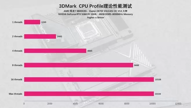 而在3DMark的CPU Profile测试中,9800X3D的表现也是相当给力,实测9800X3D的单线程分数为1249,最大线程分数为10104,表现不错,作为一款专为游戏而生的CPU,这个成绩已经完全能够满足主流用户的需求了。
