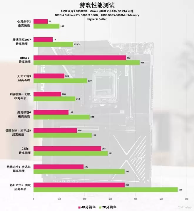 下面是玩家最关心的游戏环节。我们分别在2K和4K画质下运行了多款3A巨制。依托iGame X870E VULCAN OC V14 火神主板坚若磐石的底座支撑,锐龙7 9800X3D搭配RTX 5080展现出了恐怖的统治力,全程帧数又高又稳。显然,如果你想组建一套征服4K游戏的顶级平台,火神主板在性能挖掘上的功力完全能满足你的期待。