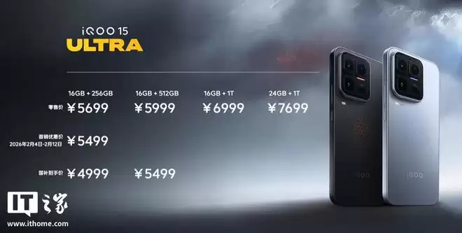 2月4日,IT之家最新资讯:iQOO 15 Ultra智能手机已于今晚正式亮相,官方售价为5499元起,在享受国家补贴后,入手价低至4999元起。