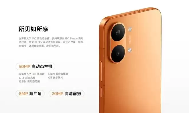 搭载光影猎人600 50MP高动态主摄,采用 1.6μm 融合大像素,F1.5光圈,还有8MP 超广角镜头和20MP前置自拍镜头。