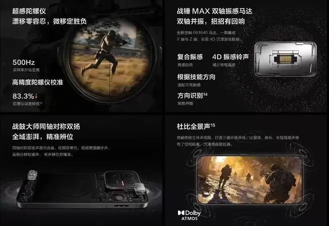 还有超感游戏肩键、超感陀螺仪和超感触控。首发战锤 MAX 双轴振感马达,搭配战鼓大师双扬与杜比全景声。