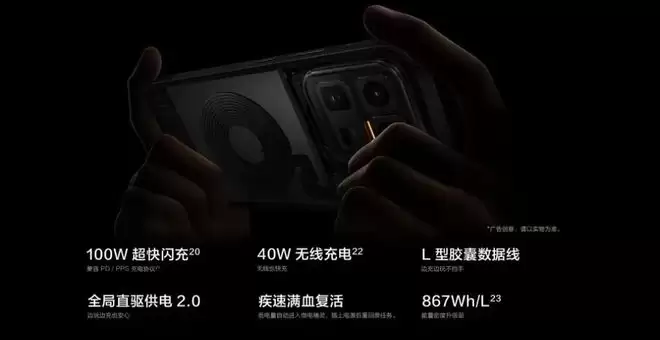续航充电部分,内置 7400mAh 蓝海电池,支持100W超快闪充、40W无线充电、OTG反向充电。