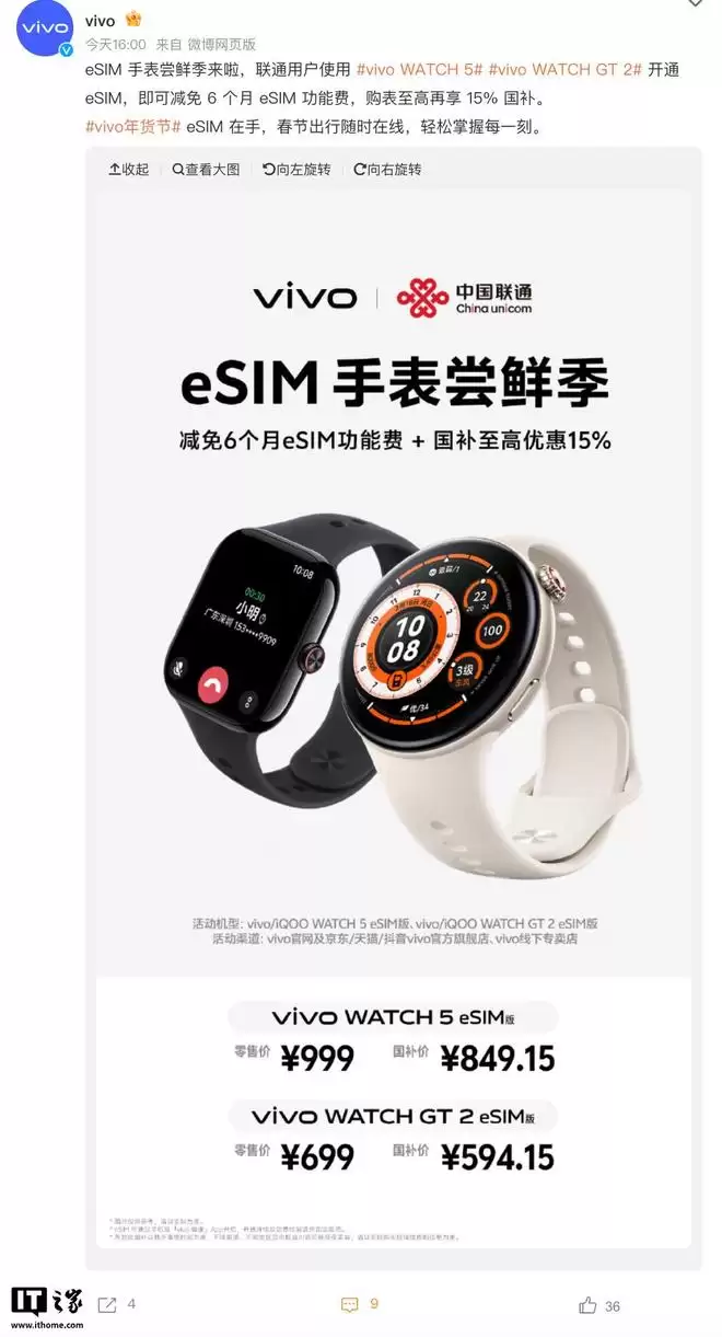 根据 vivo 官方微博于2月4日发布的消息,vivo 联合中国联通正式启动了“eSIM 手表尝鲜季”活动。即日起,联通用户为 vivo WATCH 5 或 vivo WATCH GT 2 开通 eSIM 功能,即可享受长达6个月的功能费减免优惠。
