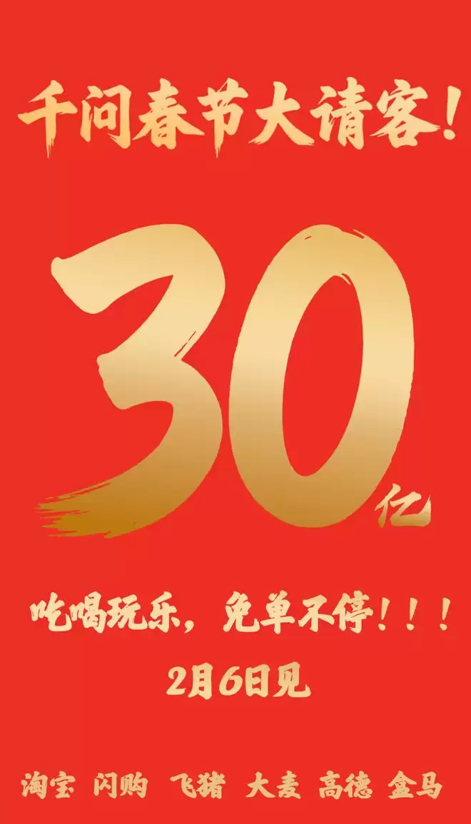 据IT之家此前报道,千问App宣布投入30亿元启动“春节请客计划”,将于2月6日正式上线。