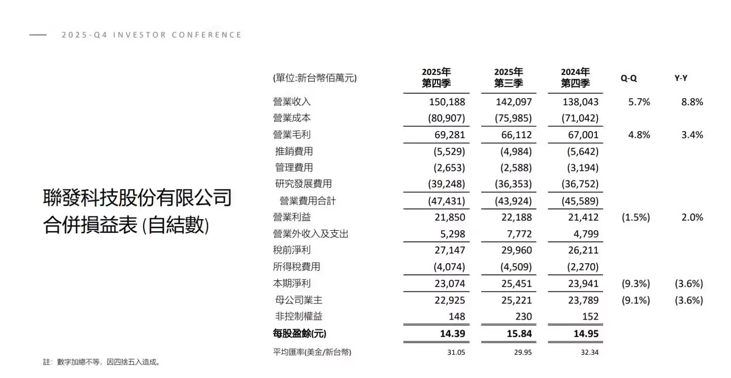 在盈利方面,联发科第四季度营业利润为218.5亿元新台币(约合48.27亿元人民币),同比增长2.0%,但环比微降1.5%;净利润表现稳健,实现230.74亿元新台币(约合50.97亿元人民币),其中归母净利润为229.25亿元新台币(约合50.64亿元人民币)。