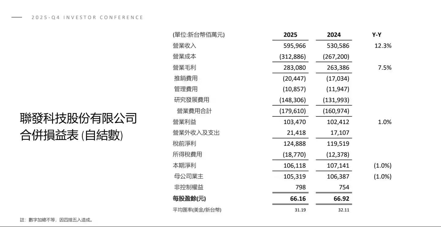 纵观2025全年,联发科交出了一份稳健的成绩单:全年营业收入为5959.66亿元新台币(约合1316.49亿元人民币),同比增长12.3%;营业利润为1034.7亿元新台币(约合228.57亿元人民币),同比增长1.0%;全年净利润为1061.18亿元新台币(约合234.41亿元人民币),归母净利润为1053.19亿元新台币(约合232.65亿元人民币),同比增长1%;研发费用达到1483.06亿元新台币(约合327.61亿元人民币),同比增长12.36%,研发占比稳定在24.9%,与上年持平。