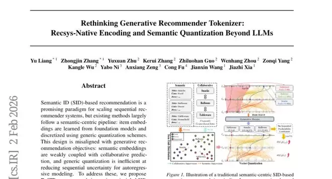 想象你在设计一个自动餐厅推荐系统。传统的做法是这样的:首先,你用一个高大上的通用"厨师助手"(比如大语言模型)来学习每道菜的特征——这个助手会分析菜名、菜的描述、食材清单等,然后给出一个"特征向量",代表这道菜的本质。接着,你把这些特征向量用一个通用的"分类工具"(比如向量量化方法)压缩成离散的"编码",最后用这些编码来训练推荐系统。