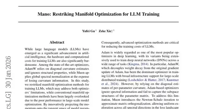 这项由香港科技大学广州校区xLeaF实验室团队完成的研究于2026年2月发表在预印本平台,论文编号为arXiv:2601.23000v1。研究团队提出了一种名为Mano的全新优化器,能够大幅提升大型语言模型的训练效率,同时显著降低计算成本和内存消耗。
