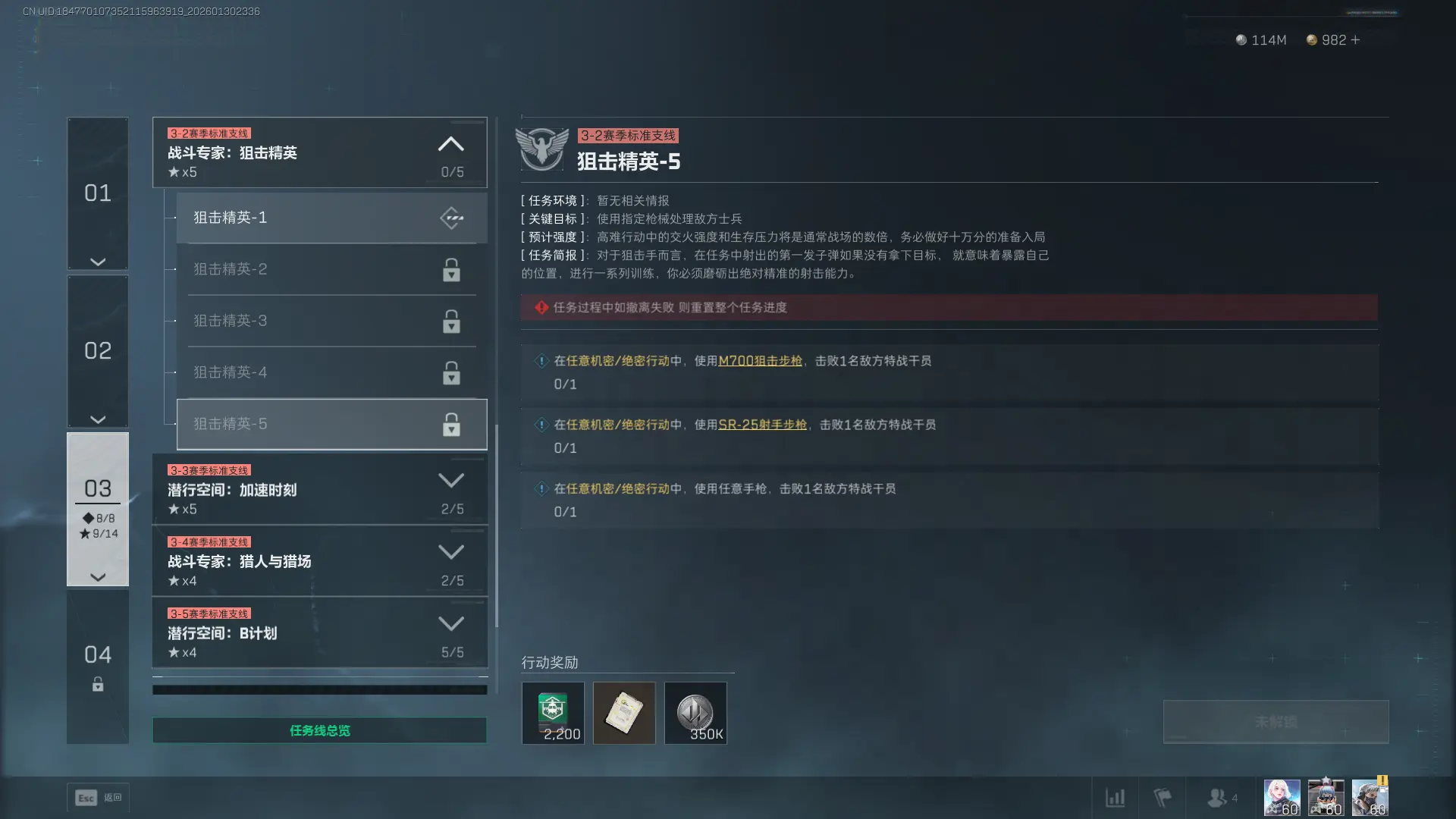 在任意机密/绝密行动中,使用【M700狙击步枪】成功击杀1名敌方特战干员。