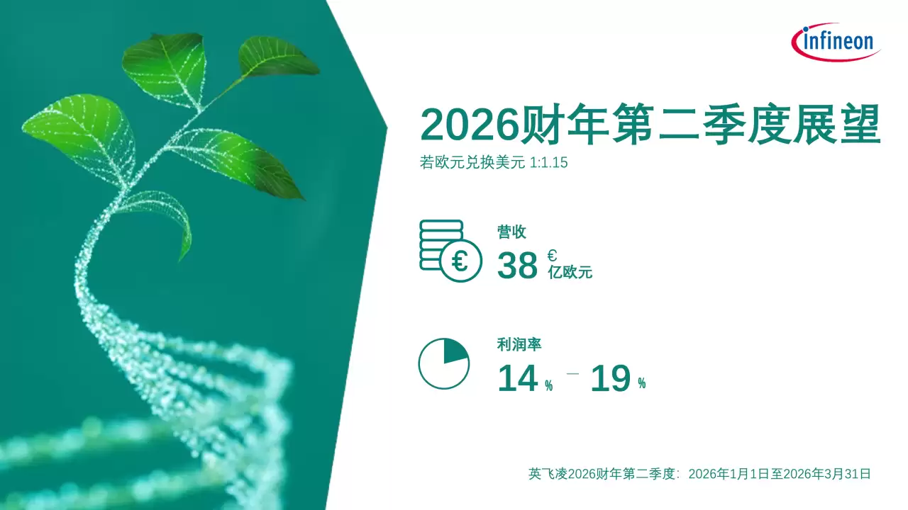 基于当前市场环境,英飞凌对2026财年第二季度作出展望。假设欧元兑美元汇率为1:1.15,公司预计营收将攀升至约38亿欧元,利润率则预估在14%至19%的区间内波动。