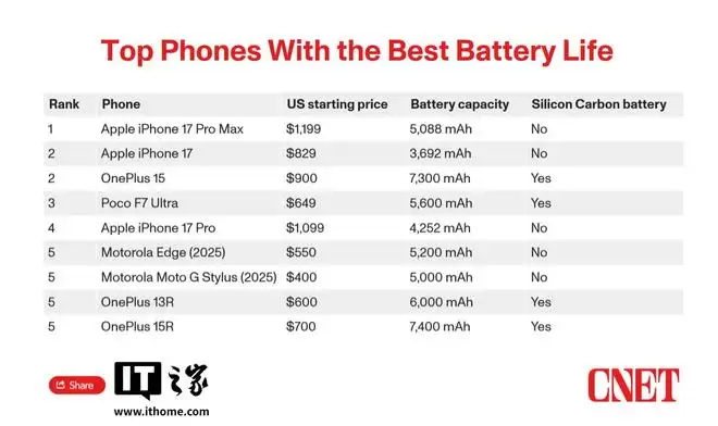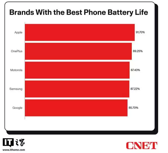 从品牌维度看,苹果与一加是目前续航表现最为突出的两个手机品牌。IT之家附上相关评测排名截图如下:
