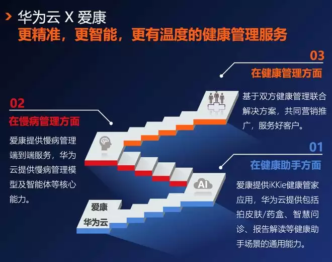 在健康助手层面,爱康将提供其成熟的AI健康管家“爱康iKKie”应用作为服务入口,在原有健康咨询、报告解读、个性化体检套餐定制等专业服务基础上,华为云提供包括智慧问诊、AI测肤、拍药搜药等健康助手场景的通用AI能力,提升爱康现有C端用户的数字化健康管理体验。在慢病管理层面,爱康提供其在全国布局的线下健康管理中心网络及慢病管理端到端服务能力,华为云则提供先进的慢病管理模型及智能体等核心AI能力,形成线上线下结合的智能慢病管理体系。在解决方案层面,基于双方共同打造的健康管理联合解决方案,华为云与爱康将开展联合营销推广,共同服务客户,探索创新的商业模式。