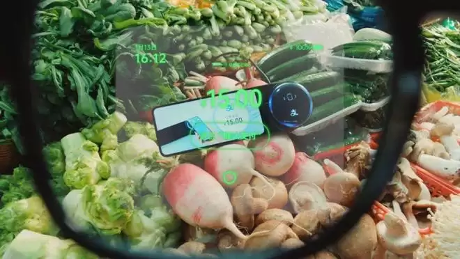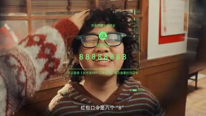 如果你有的话,那么你就可以秀一下。比如走在喜气洋洋的街道上,看见一个很特别的福字,然后停下来,单手搭在时尚的多功能镜腿上,还可以顺便凹个造型,眼镜对准那幅字,点一下拍摄键,同时说一句“扫福”,视野里的“福”字就被缓缓圈选,同时,口袋里手机就会微微一震,提示你“福卡已到账”。