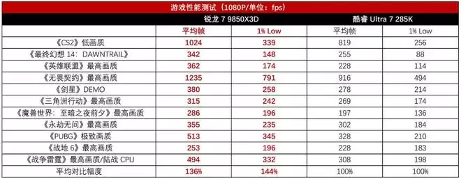 游戏实战测试部分,我们选择了RTX 5090 D,并且使用1080P分辨率,确保显卡不会成为瓶颈。我们测试了11款多人在线的网络游戏,锐龙7 9850X3D的表现可以说是完胜酷睿Ultra 7 285K。在平均帧率方面,《CS2》和《无畏契约》的平均帧率都达到了1000fps以上,轻松实现千帧游戏体验。即便是在领先幅度比较低的《战地6》《永劫无间》《三角洲行动》三款游戏中,锐龙7 9850X3D也实现了11%、18%和17%的领先,也不算小。《战争雷霆》领先幅度达到了60%,《英雄联盟》《PUBG》领先幅度分别为56%和58%,差距明显。综合所有游戏的表现,锐龙7 9850X3D平均领先36%,这已经是越级的领先表现。