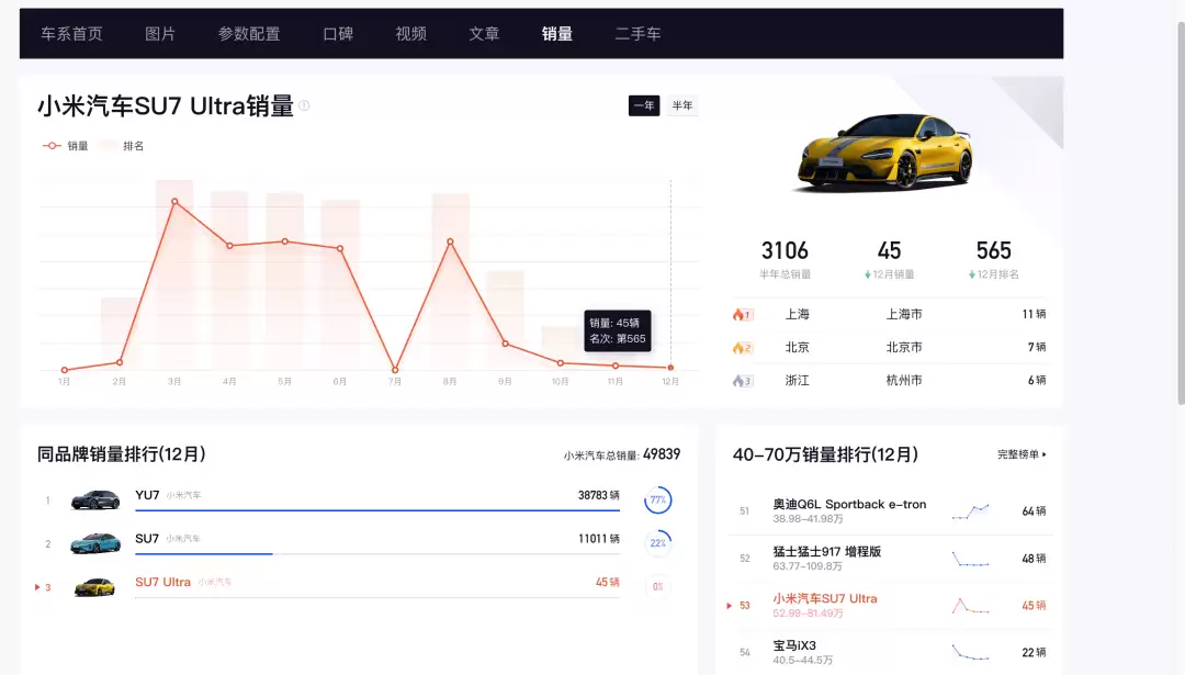 然而,市场表现很快便出现了转折。根据第三方平台的数据显示,SU7 Ultra的销量自2025年9月起开始出现断崖式下跌:9月售出488辆,10月骤降至130辆,11月已不足百辆,12月更是仅有45辆。虽然全年累计销量勉强突破1万辆,完成了初期目标,但其中超过70%的销量都集中在上半年,下半年的总销量甚至不足3000台。这一明显的下滑趋势,与专属团队解散的时间节点高度吻合。