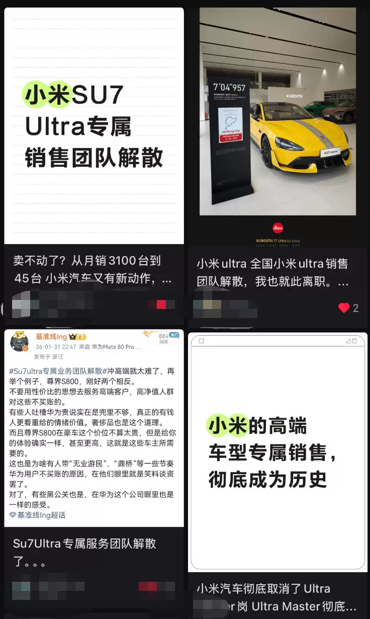 最新消息称,小米汽车内部对销售体系进行了重要调整。原先专为高性能车型SU7 Ultra组建的特殊销售团队“Ultra Master”现已正式解散。根据内部人士透露,该团队在一月底已完成人员疏散,相关的销售权限已全面下放至各大常规销售渠道,包括入门级销售人员和门店主管在内的所有一线人员均可接待客户并完成交易流程。