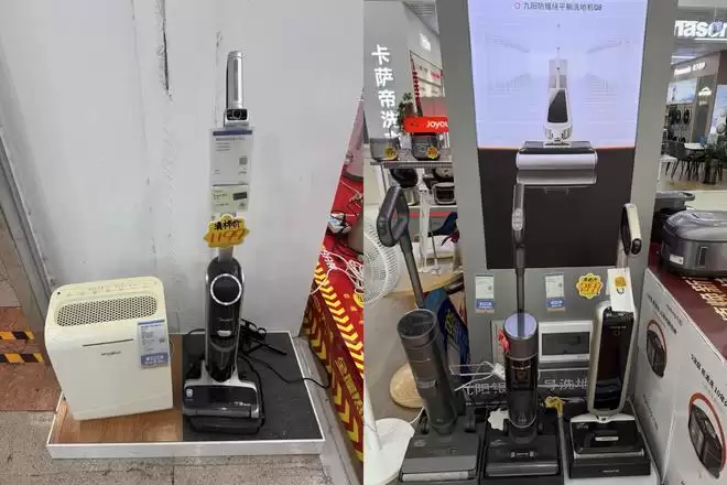 在这家苏宁门店,小雷环视全场,就看到两个品牌的智能清洁产品,一款挂上「清样价 1199」的美的洗地机产品,以及在九阳品牌专区陈列的多款洗地机产品。对,你没看错,就是厨小电品牌的那个九阳。