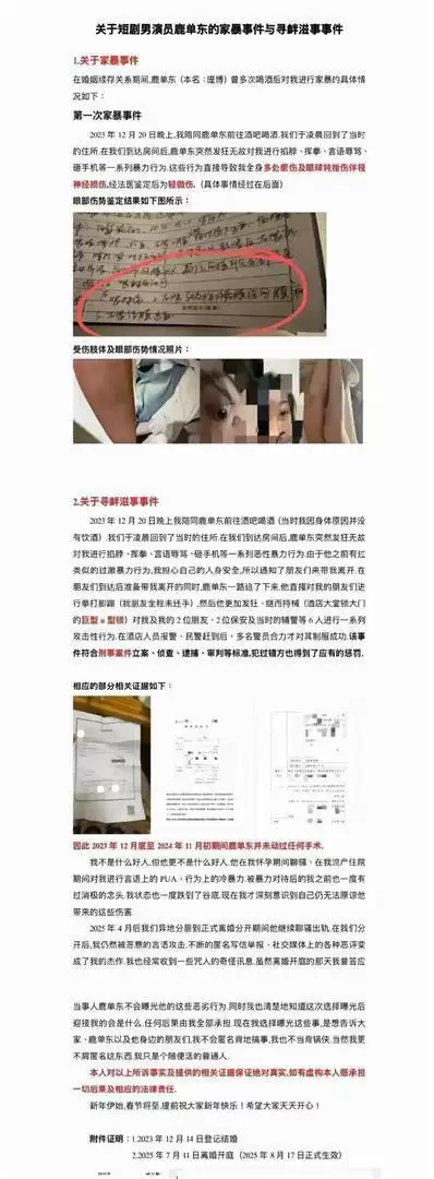2026年2月6日深夜,短剧演员鹿单东的前妻用一篇微博长文炸翻了热搜。 九张证据截图排开结婚证、伤情鉴定、司法文书、暧昧聊天记录,甚至还有酒店监控描述的U型锁械斗。 这位在《秦爷的小哑巴》《明月引君心》里饰演深情霸总的男演员,现实中被指控领证仅六天就对妻子掐脖挥拳,婚内出轨多位女性,因持械伤人被判刑十个月,却靠“重病住院”的谎言欺骗粉丝整整一年。