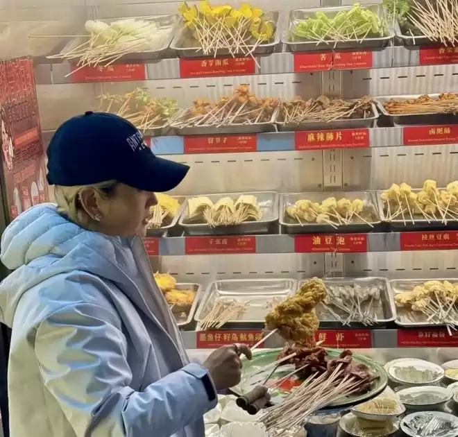 2026年2月上旬的一个傍晚,上海静安区一家主打成都红油锅底的网红串串店内,一位戴着口罩却眼带笑意的女性顾客引起了其他食客的注意。 她双手端着满满两大盘串串,盘子里堆满了香菜牛肉串。