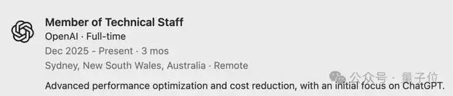 入职后,他将加入ChatGPT性能团队,在澳大利亚远程办公,向团队负责人Justin Becker汇报工作。