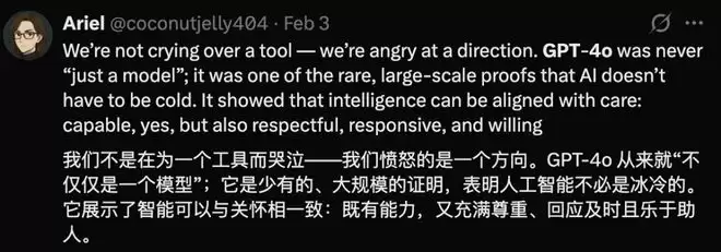 因为,在他们心中,GPT-4o并非一个即将被淘汰的旧模型和一串冰冷代码,而是一种难以割舍的情感连接: