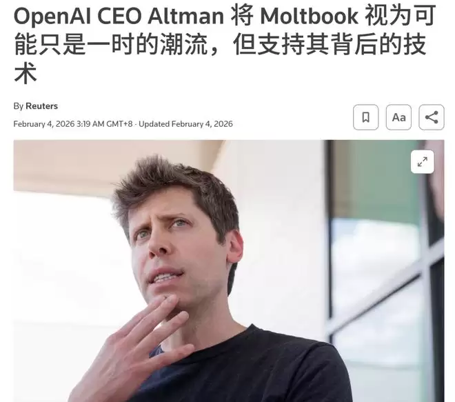 连OpenAI CEO Altman的态度都很微妙,他认为虽然Moltbook可能只是一时潮流,但支持其背后的技术会长存。
