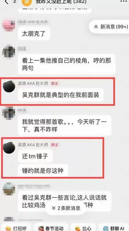 节目刚播完, 就有网友爆料, 梁源在一个三百多人的聊天群里破口大骂, 原话是说吴克群装, 后面还带了脏字, 说“锤的就是你这种”