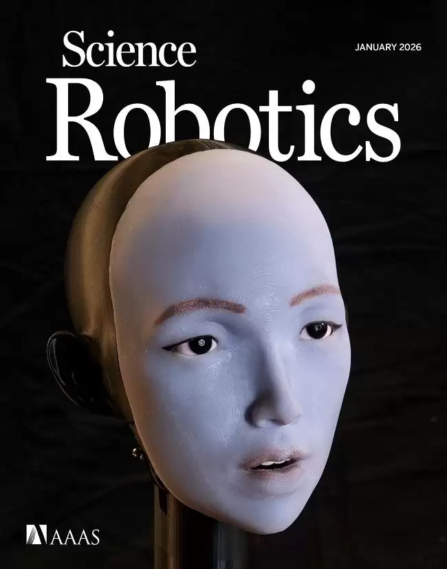 1 月 15 日,Science Robotics 封面刊发了胡宇航团队关于 Emo 面部机器人的研究,展示了其如何通过学习实现与语音、歌曲同步的唇部运动,这也是 Science Robotics 首次将人脸机器人刊登在封面。这项工作源于他在哥伦比亚大学的博士研究,也是他近两年在 Science 和 Nature 子刊上发表的第三篇论文。