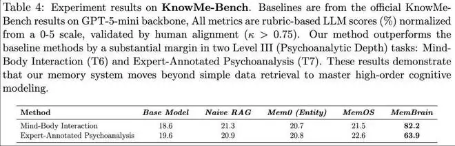 此外,在 Hugging Face 广受关注的 Knowme-Bench 基准中,MemBrain 的实验结果表明,在 KnowMeBench Level III: Psychoanalytic Depth:Mind-BodyInteraction (T6),Expert-Annotated Psychoanalysis (T7) 难度等级最高的两个评测中更是比现有评测结果大幅提升超 300%,显示出 MemBrain 在高阶认知理解任务中显著的性能优势。Knowme-Bench 的核心挑战在于要求模型超越基础的精确记忆抽取,实现基于记忆内容的深层分析与复杂推理。