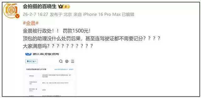 狗仔在发布处罚截图之后,直接艾特金晨,问她这次换不换头像(前几天金晨道歉后换头像阴阳网友)……