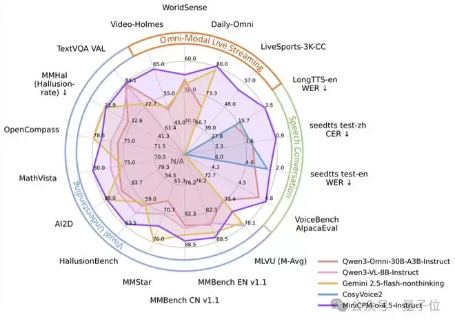 此外,值得一提的是,在Benchmark测试上,MiniCPM-o4.5的表现同样亮眼。