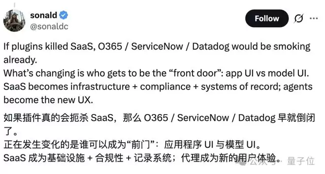 的确,如果AI真的这么容易就能扼杀SaaS,那Office 365、ServiceNow、Datadog早就该倒下了。