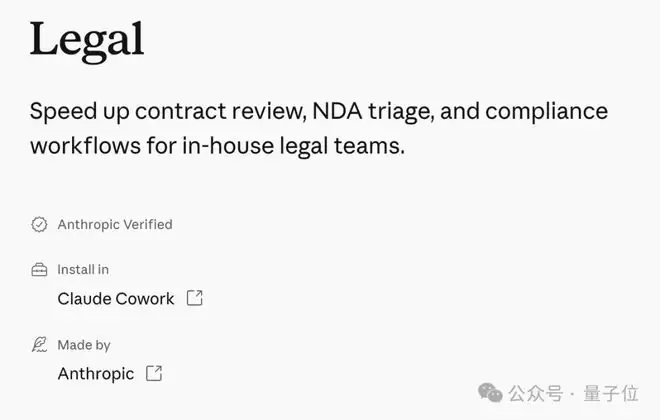 而这次引发市场恐慌的,是其中的法律插件,叫Legal。可以自动完成合同审查、NDA分流、合规检查、法律简报等工作。