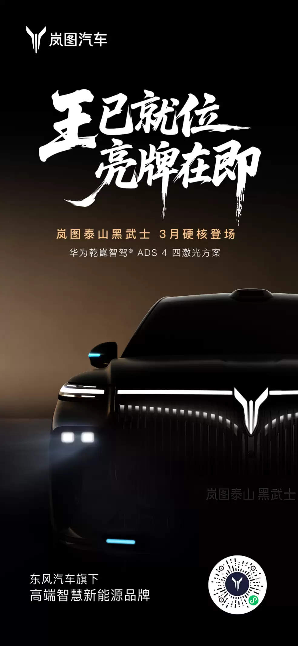 2月9日,岚图汽车通过其最新社交平台发布视频,正式宣布旗下岚图泰山黑武士版将于今年三月上市,并采取限时发售策略。